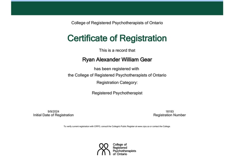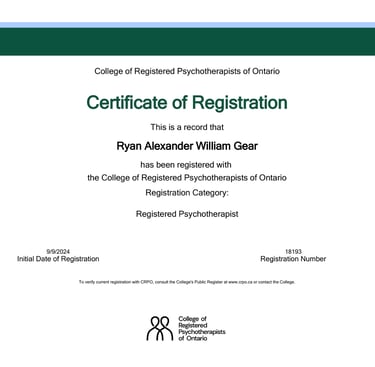 I worked towards my license and obtained my Registered Psychotherapist status through the College of Registered Psychotherapists of Ontario (CRPO), Canada. This allows me to practice independently by abiding by the rules and regulations set out by the